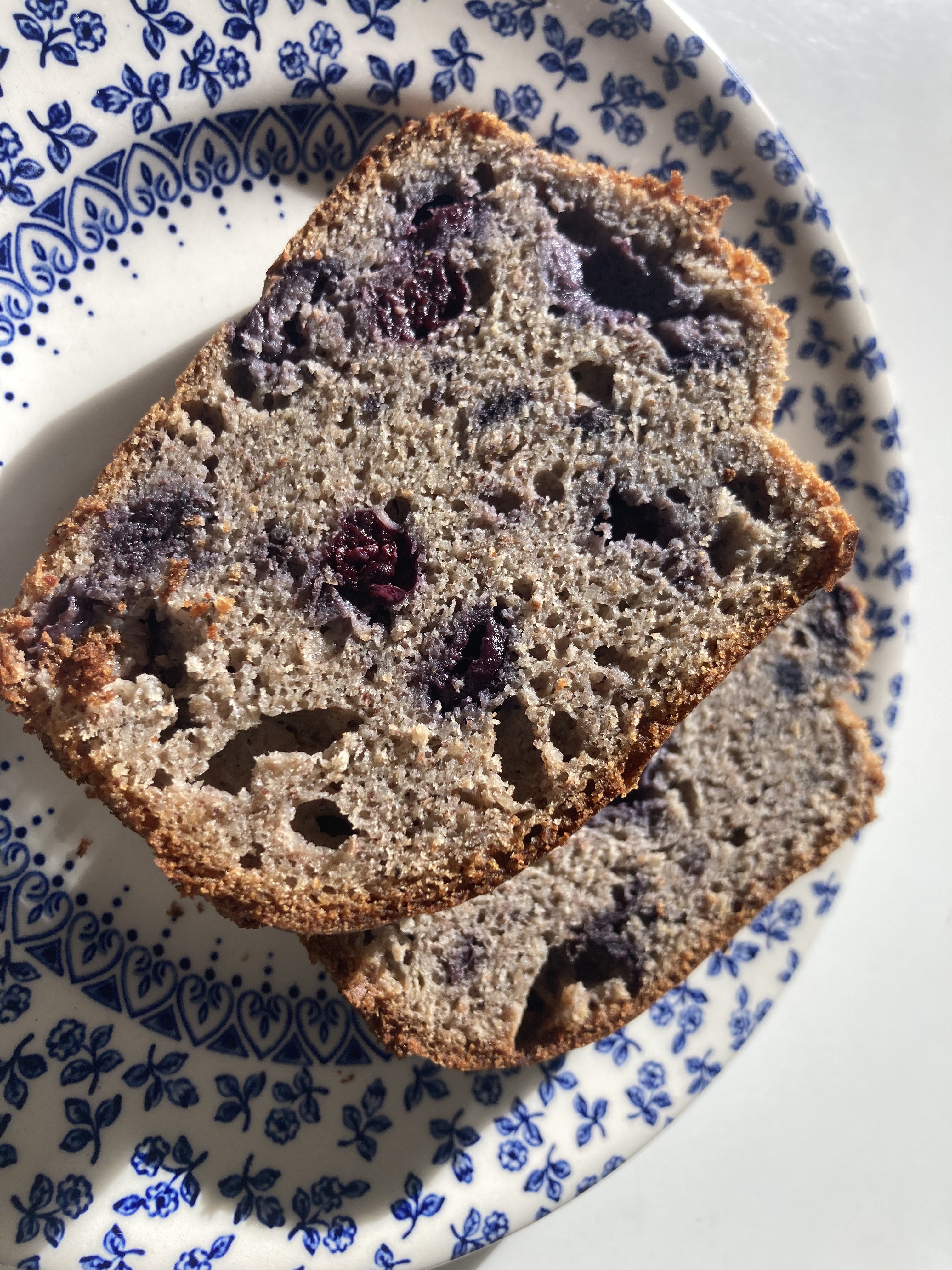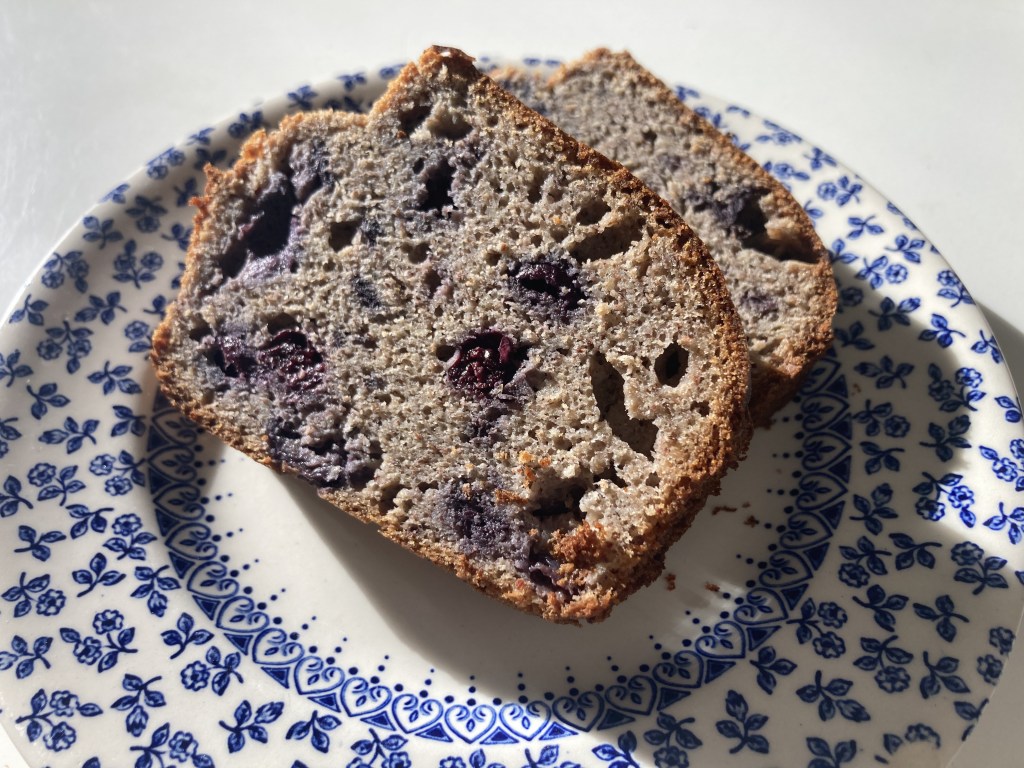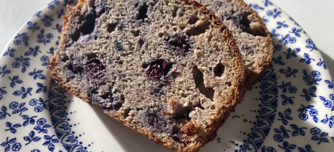 MĂ©langer 3 oeufs Ă 2 grosses bananes Ă©crasĂ©es. Ajouter 4 cĂ s de purĂ©e d’amandes complĂšte 60g h’huile de coco dĂ©sodorisĂ©e fondue. Rajouter 70 g de farine complĂšte de sarrasin et 80g de farine de petit Ă©peautre intĂ©grale. 2 bonnes poignĂ©es de myrtilles et 1/2 sachet de levure chimique. 35 min au four Ă 180°C. Attention peu sucrĂ© ! Possible de rajouter un peu de miel d’acacia sur une tranche pour les becs sucrĂ©s.đ.
