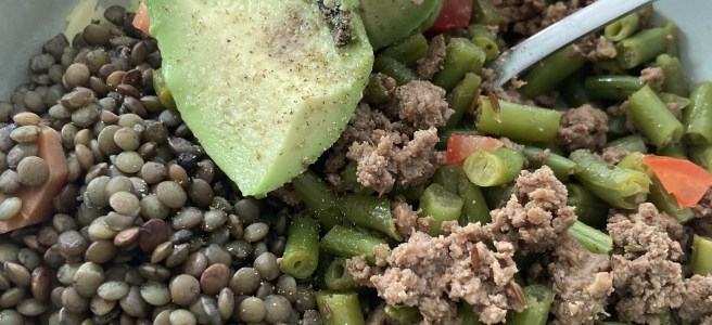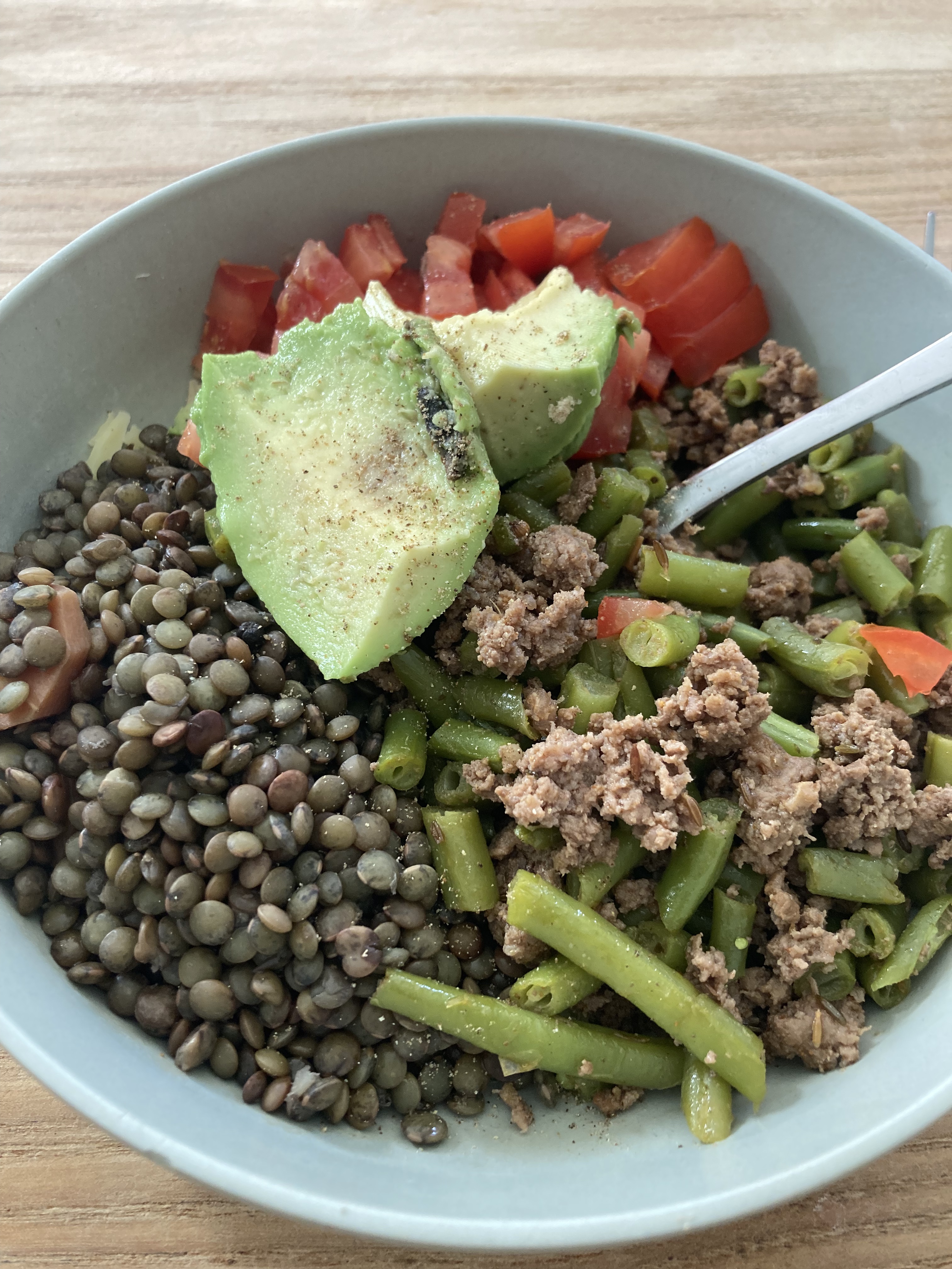 IngrĂ©dients : Lentilles vertes, aromates (laurier et de la sarriette, du thym ou de l’origan, clous de girofle), 1 cĂ c de Carvi ou Cumin en graines, tomates fraiches si saison, haricots verts, carottes, 200g de viande hachĂ©e ou tofu fumĂ© ou tofu lactofermentĂ©. Huile d’olive bio. Avocat.