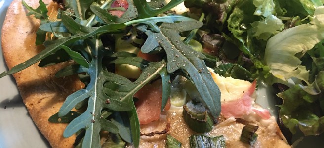 Pour la garniture : Du chèvre frais, une brique de crème au soja, un peu de jambon blanc ou cru, une petite botte d’oignons blancs, de la roquette, de l’origan frais et/ou de la sarriette et/ou de la marjolaine.